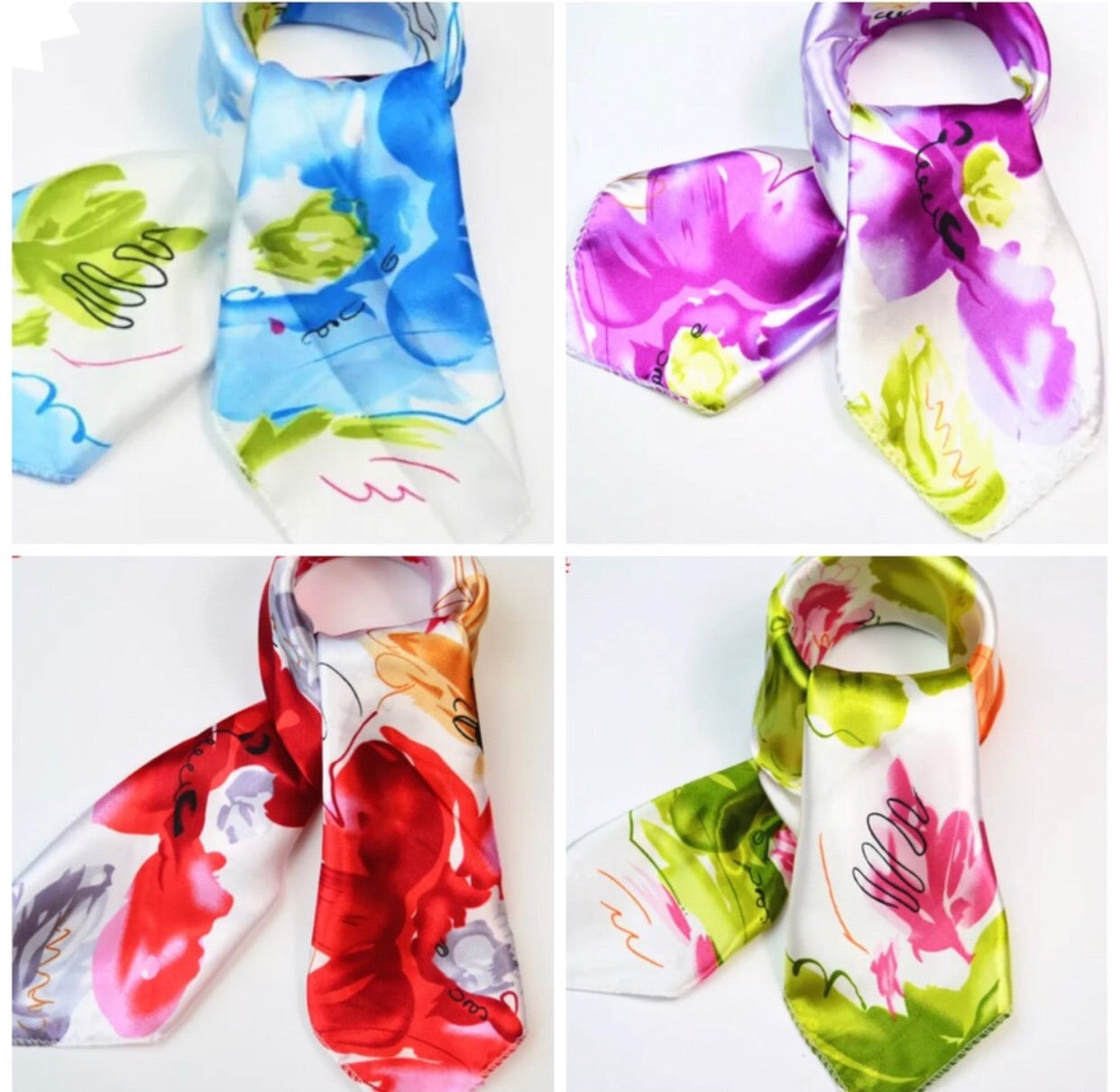 These are lovely silk look satin ladies scarves. Available in multiple color patterns. Size is 20 x 20. Colors #1, #3, #4, #5.