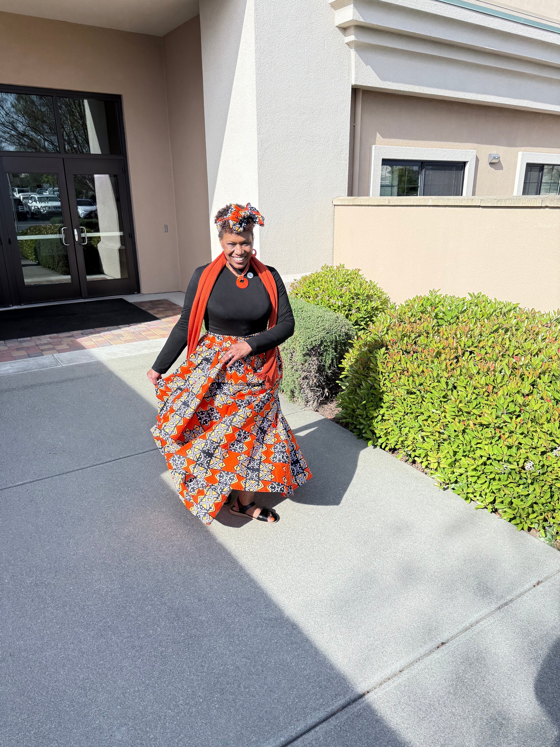 African Print Full Skirt with Coordinating Head Wrap (Orange Black Squared)