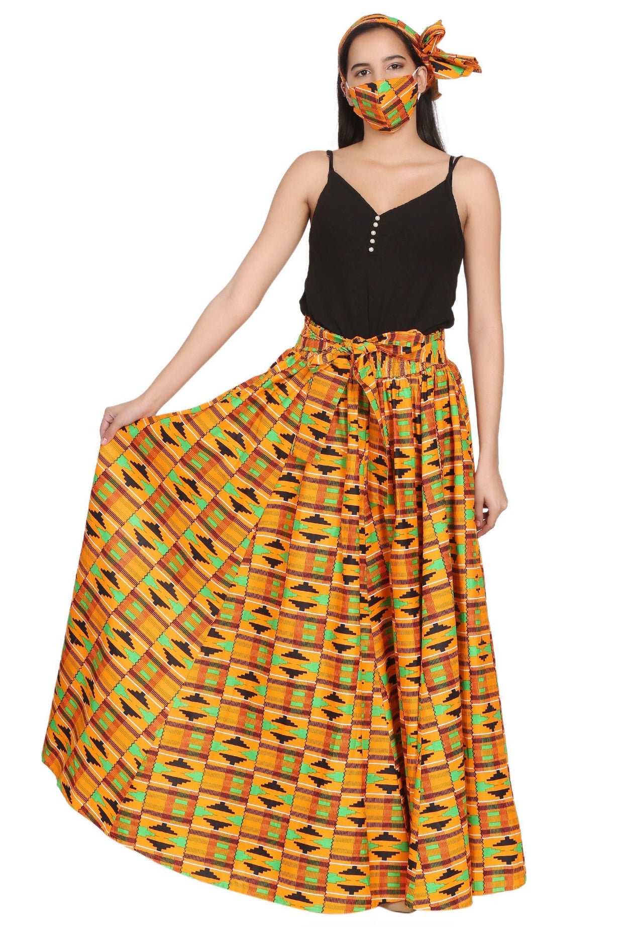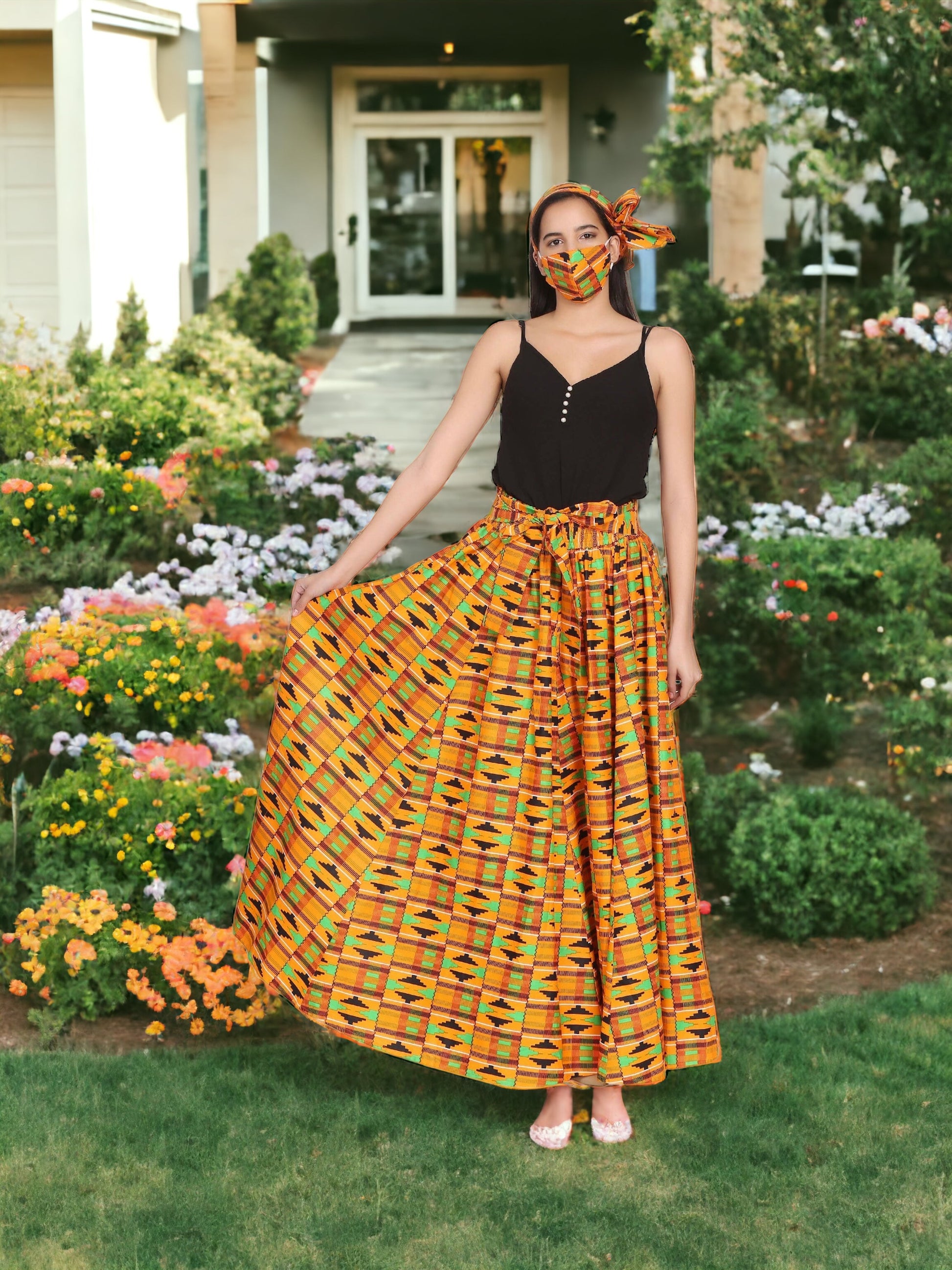 Hand Made African Print Full Skirt with Coordinating Head Wrap and Facemask (Orange, Green, Black)