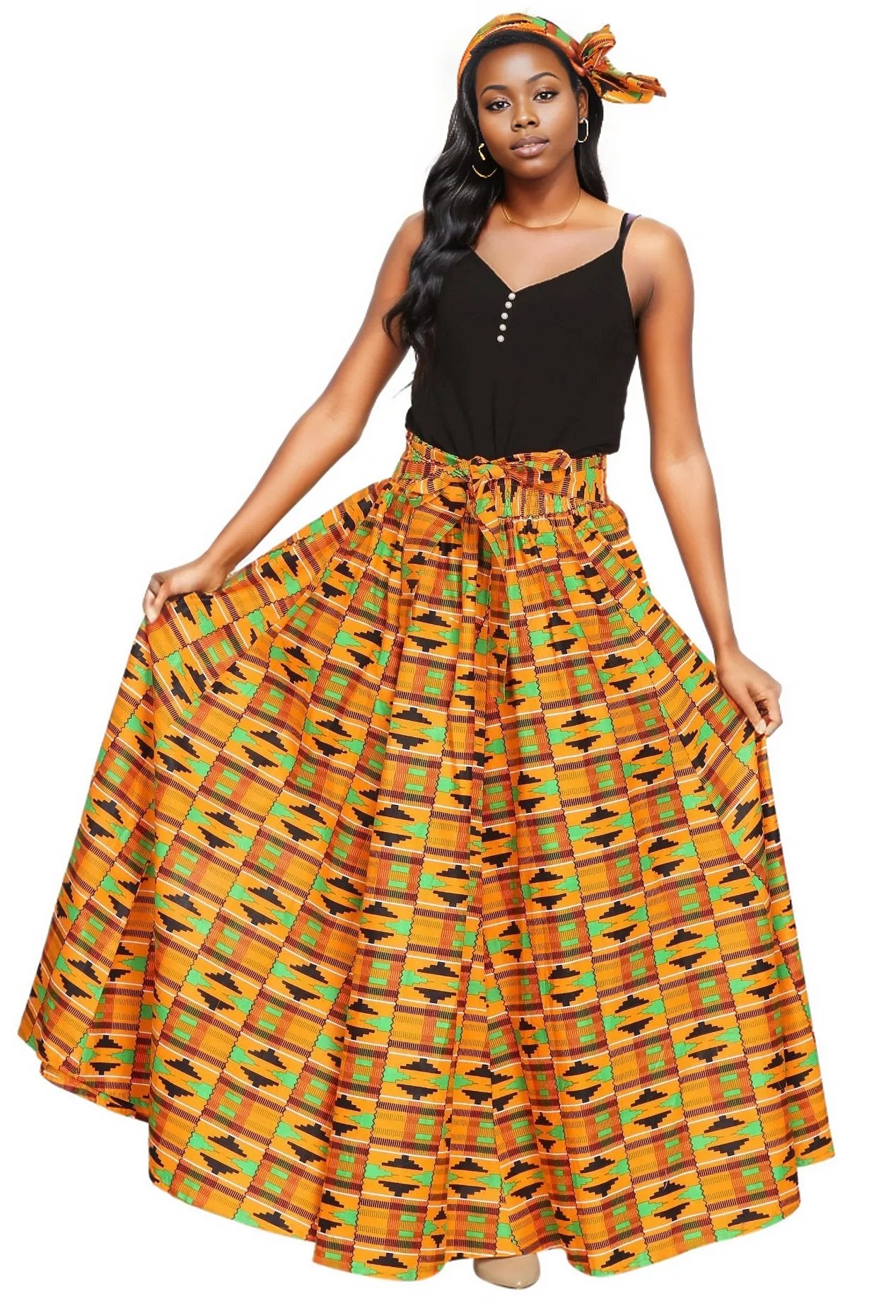 This exquisite skirt features a stunning African print in three vibrant hues, complemented by a coordinating head scarf and face mask for versatile wear. Crafted from 100% cotton, this full-length skirt boasts an elastic tie waist for a comfortable, yet elegant fit. Hand-wash only for best results. One size fits most. Simply gorgeous!