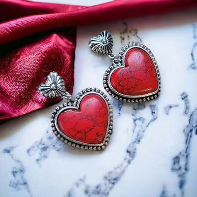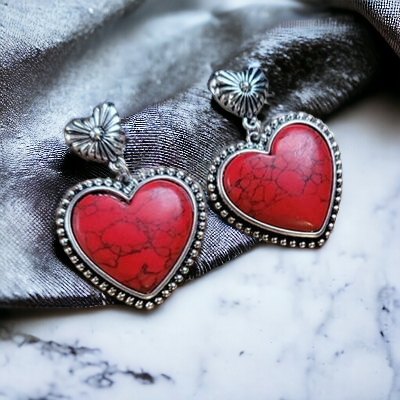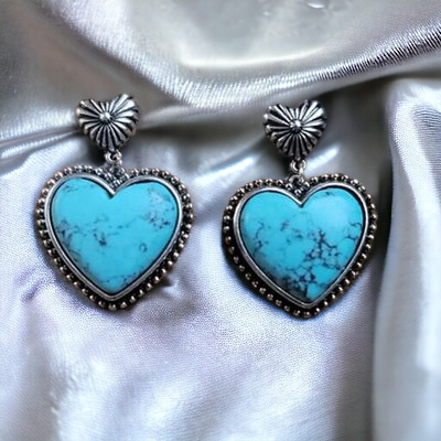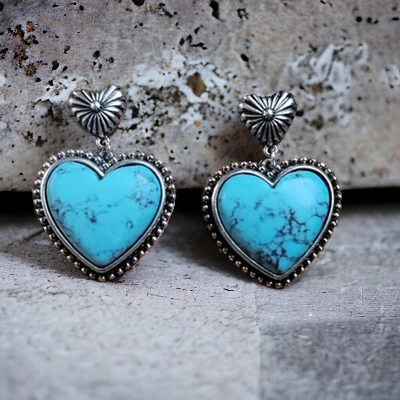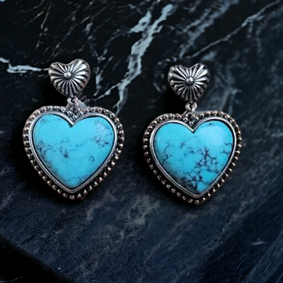 - Crafted from a delicate alloy, expertly silver-plated and adorned with artificial turquoise, these heart dangle earrings exude luxury and exclusivity. To preserve their beauty, avoid wearing during exercise as sweat may react with the metals, gradually diminishing their splendor.