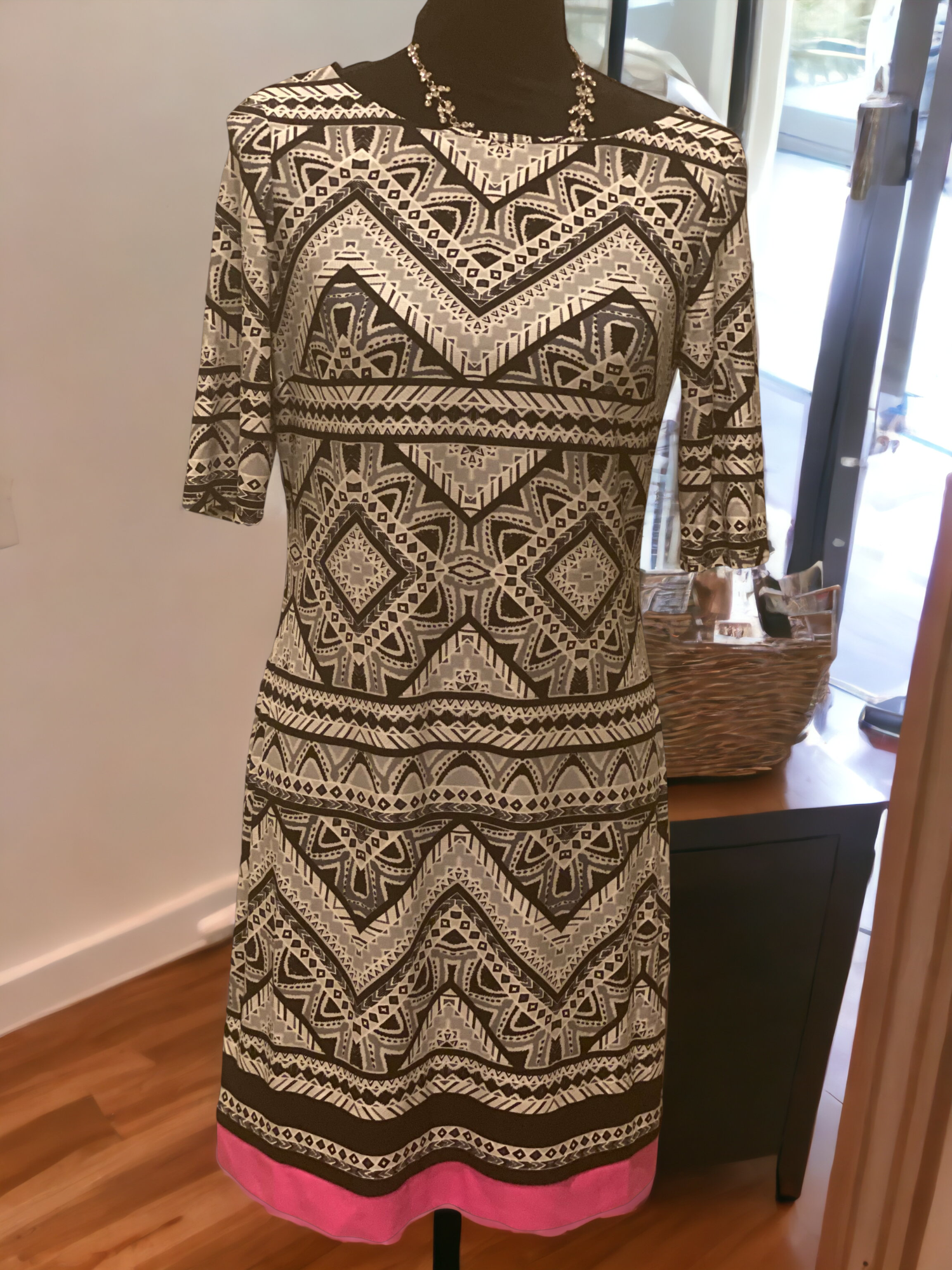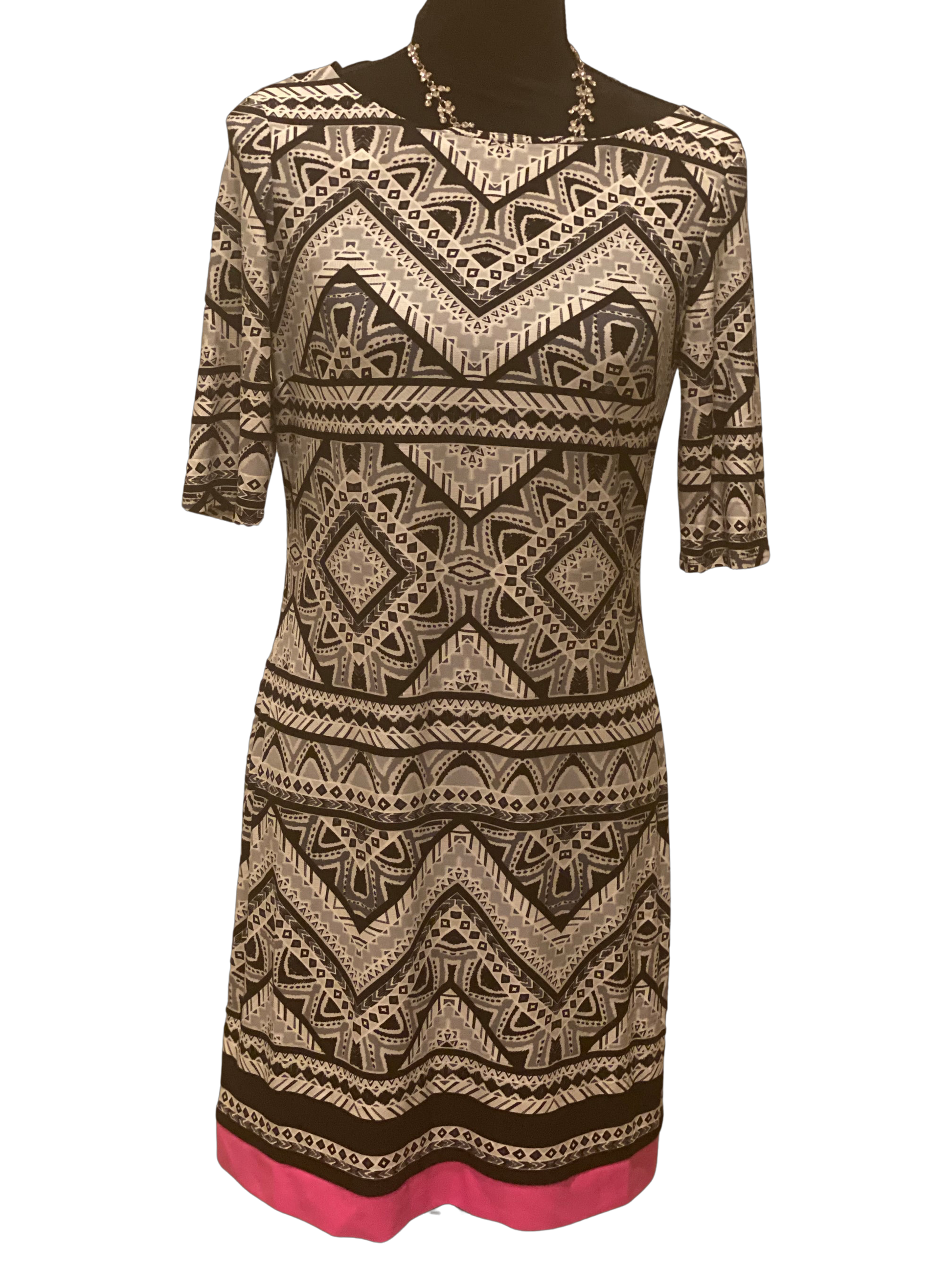 This is a beautiful Eliza J Blouse / Dress (depending on person’s height) made of polyester and spandex. It’s long in length with 3/4 long sleeves. It’s black, white, and pink with geometrical black print throughout. This item ships immediately!