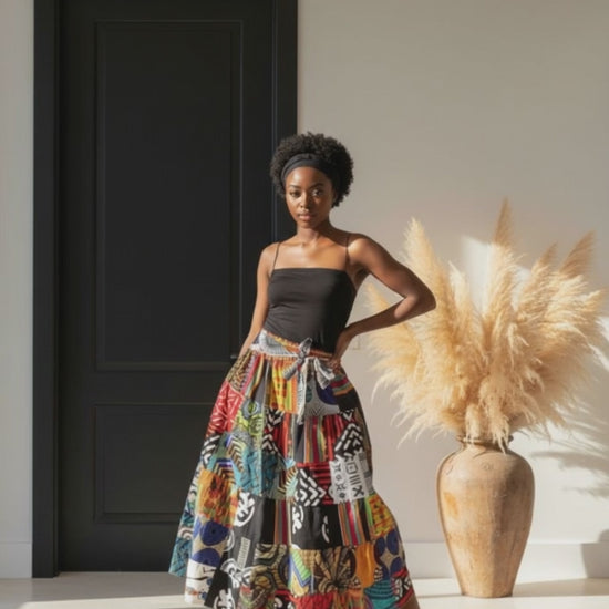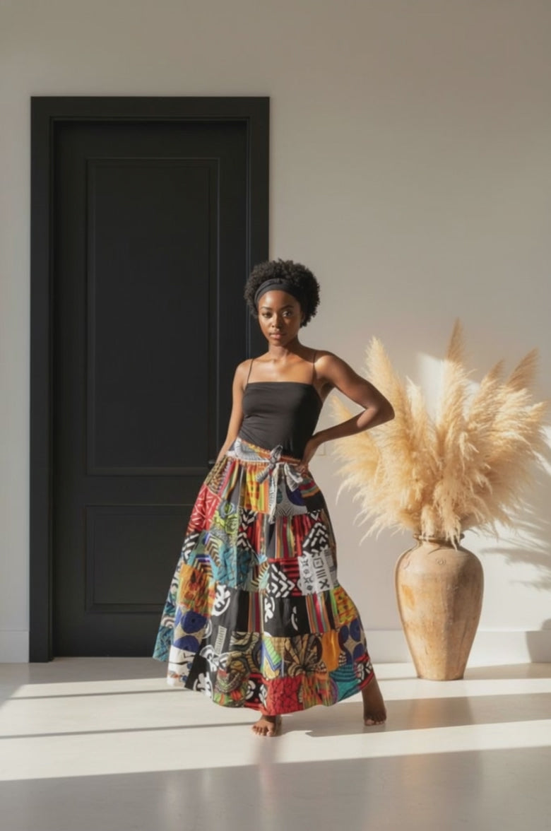 This full-length women's skirt features a unique patch design with an elastic waistband and convenient side pockets. Made from 100% cotton, each piece showcases a slightly different color and pattern arrangement, making every skirt one of a kind. Designed to fit most sizes from S to 2XL, this multi-colored skirt combines comfort and individuality effortlessly.