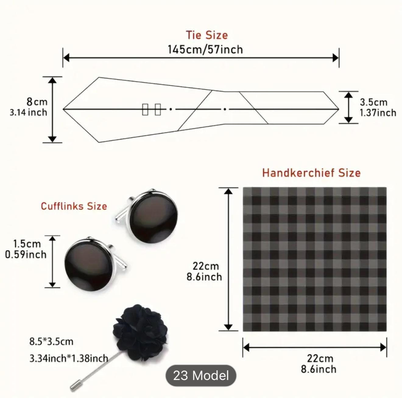 The necktie is 59.06” in length, and 3.35” at the widest portion. The pocket square is 10” x 10”. Hand tailored and made of silk.