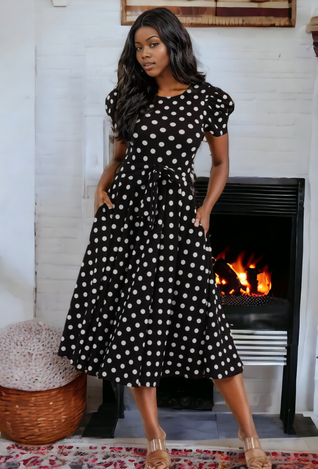 This polka dot print dress is a stunning addition to any wardrobe. The crew neckline and short puff sleeves give it a playful and feminine touch, while the midi length and waist tie provide a flattering silhouette. The dress is made of a combination of polyester and spandex, making it comfortable to wear and easy to move around in. The sleeves are 3/4 in length, perfect for any season. The back zipper closure and side pockets add practicality to this stylish dress.