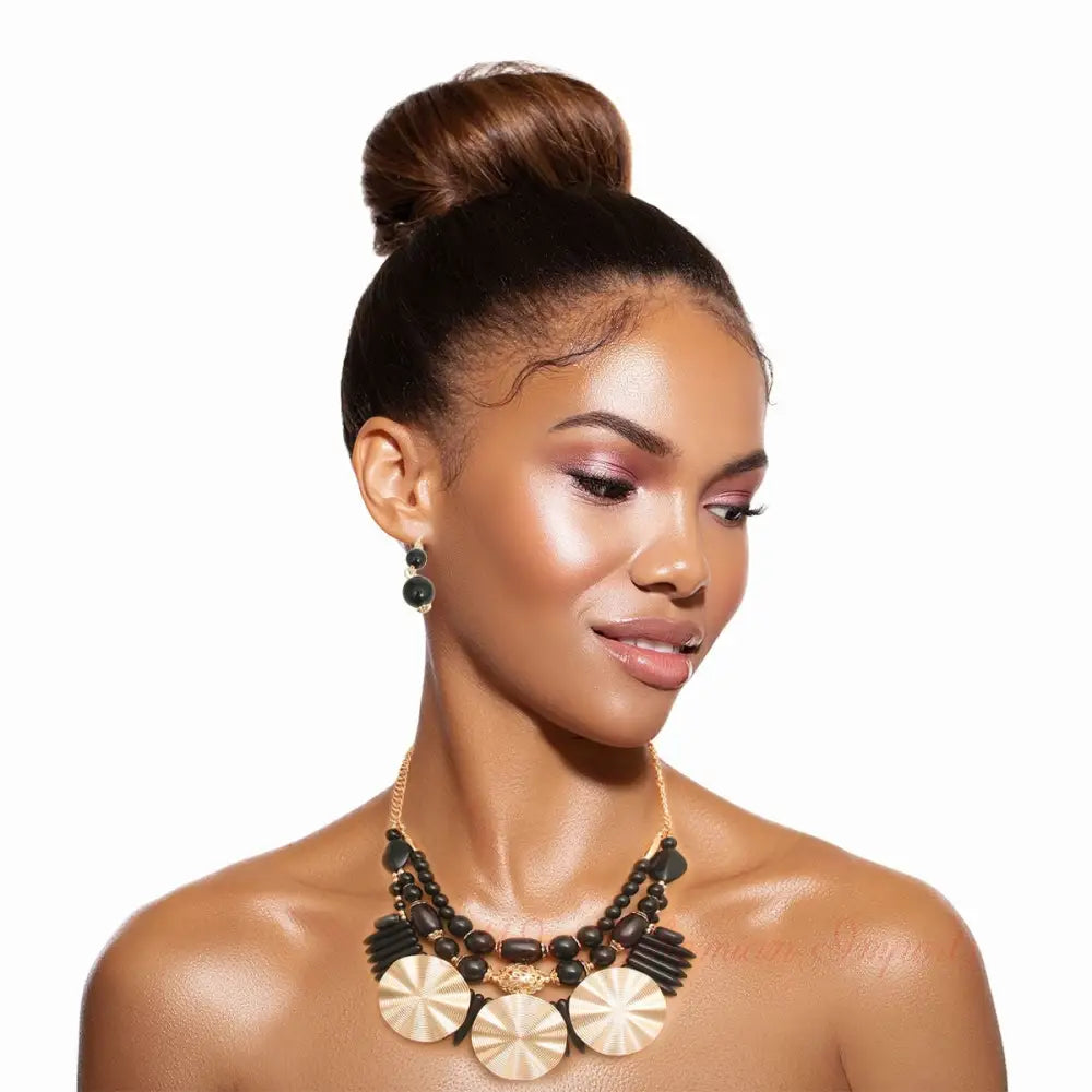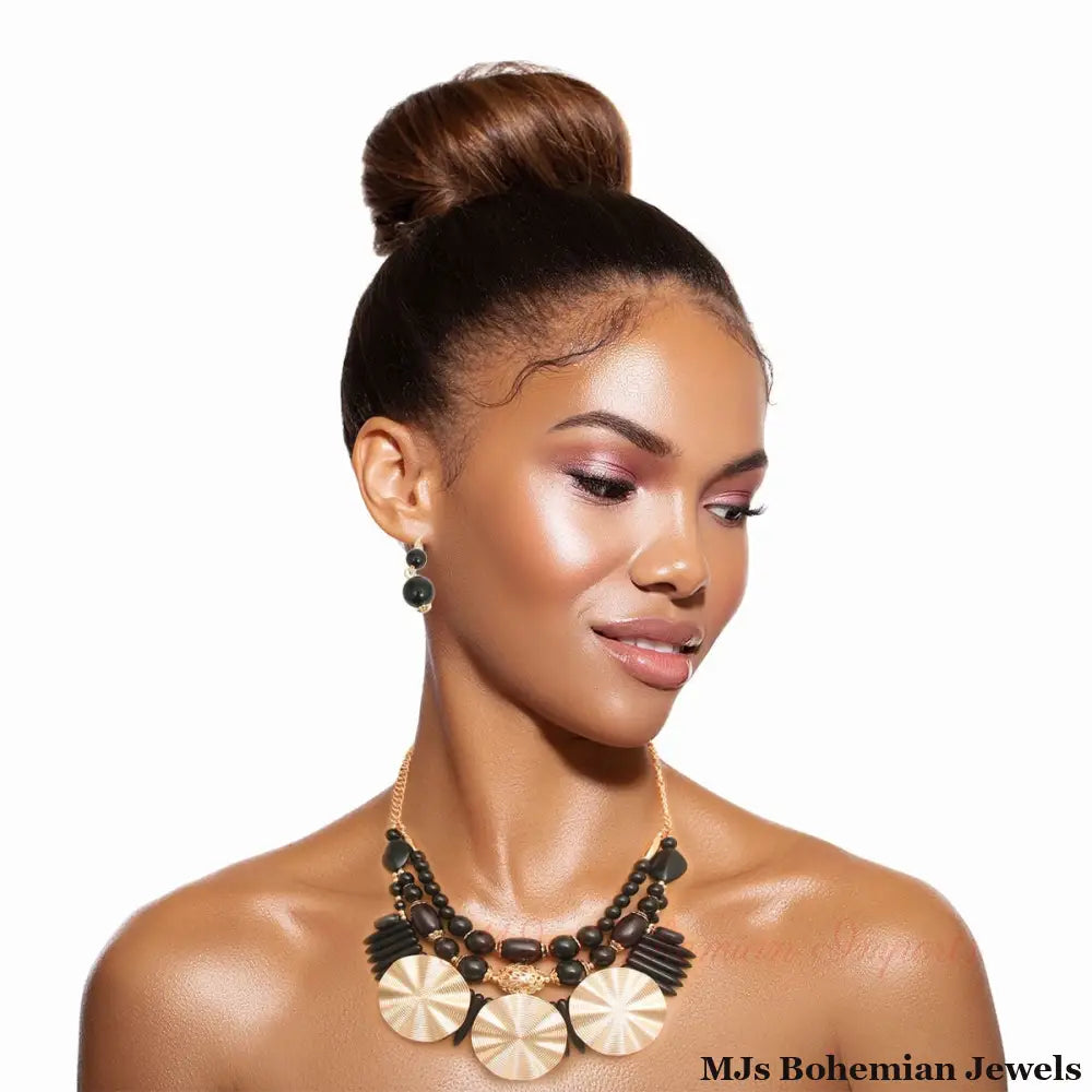 Gold Chain Layered Necklace Set Featuring Black Beads in a Variety of Shapes and Wavy Gold Metal Details. Gold Detail measures 1.95 inches