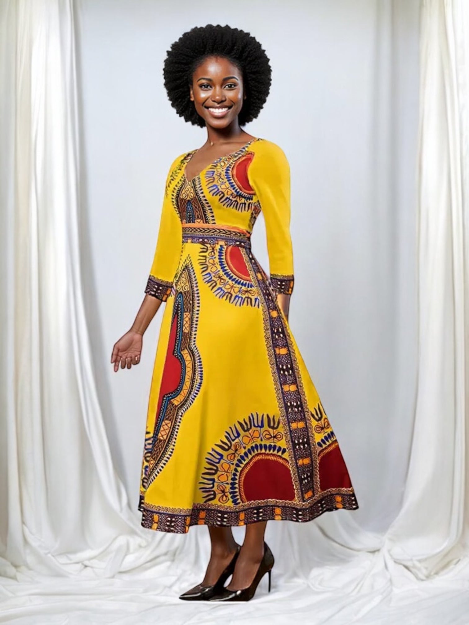 Elegant African Print Maxi Dress – Sizes S to 3XL (Yellow)