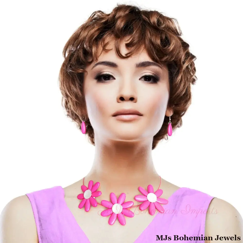 Showcase your sophistication with this fuchsia triple wire collar necklace set, highlighting mesmerizing 2.25 inch acrylic flower accents.