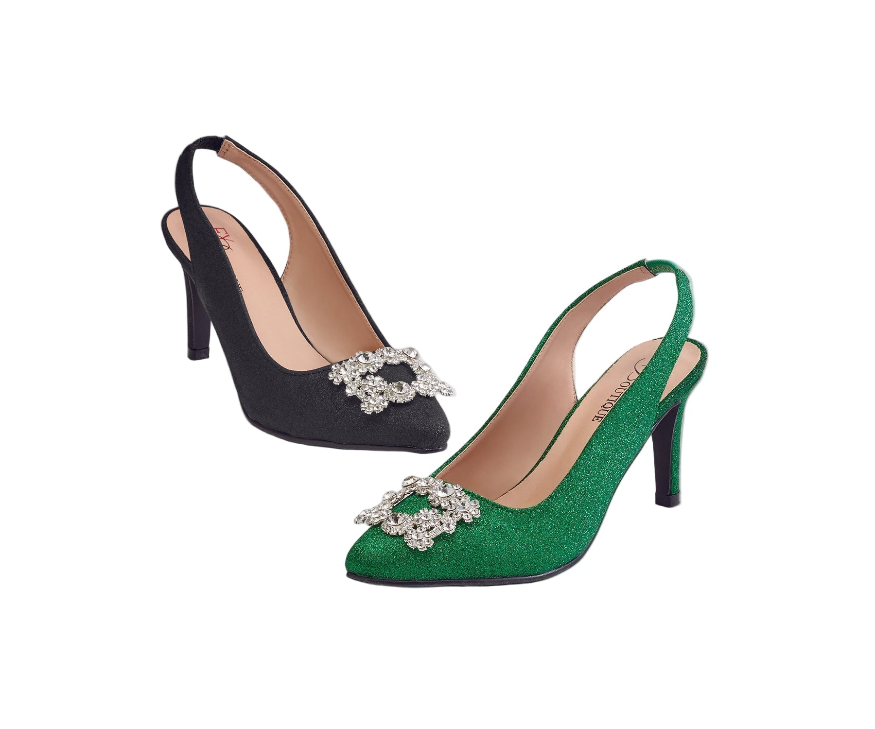 Hey there twinkle toes! These stylish slingbacks in glam glittery fabric with jeweled toe-buckle accents will have you stepping out in style. 3" heels. Stretch-inset straps. Cushioned insoles. Fabric and manmade materials. Imported.