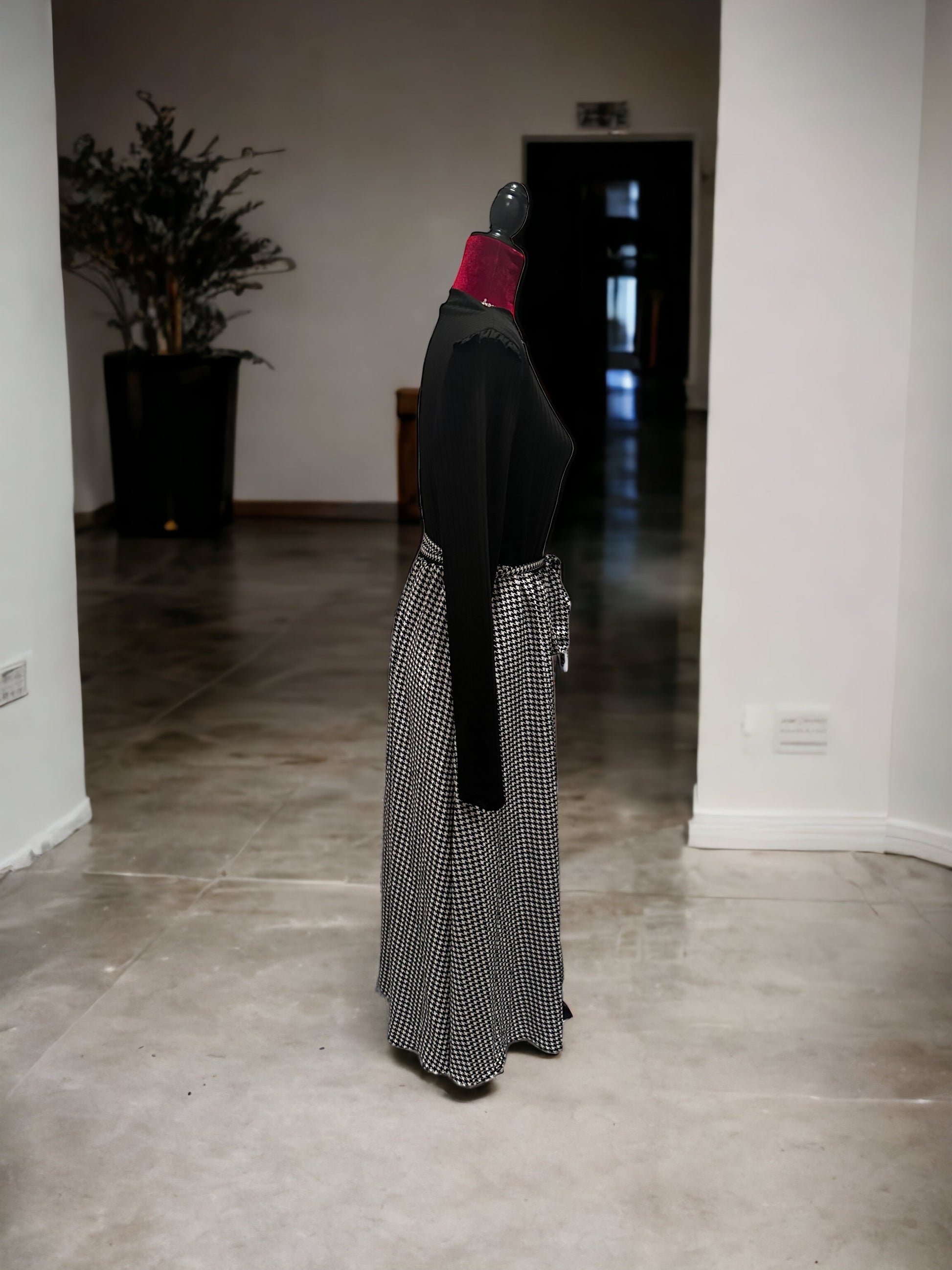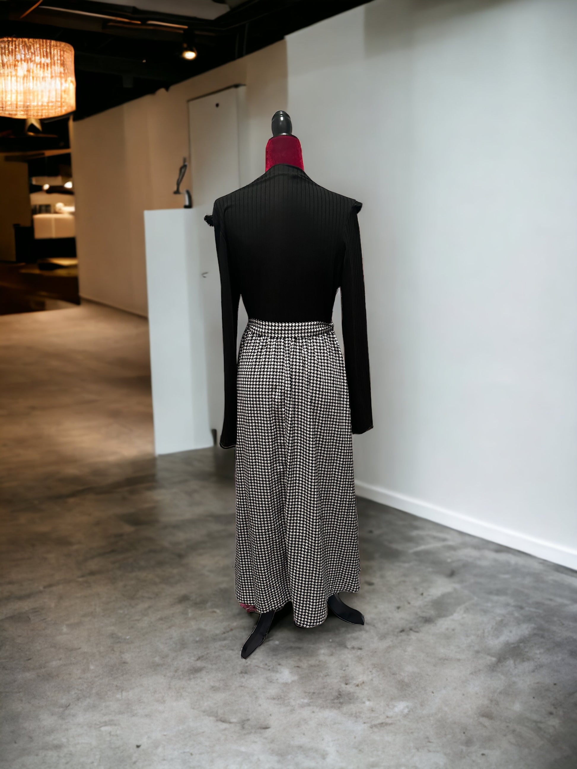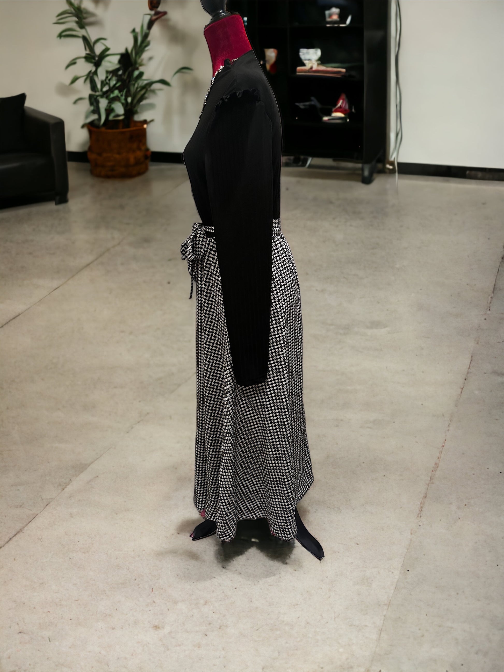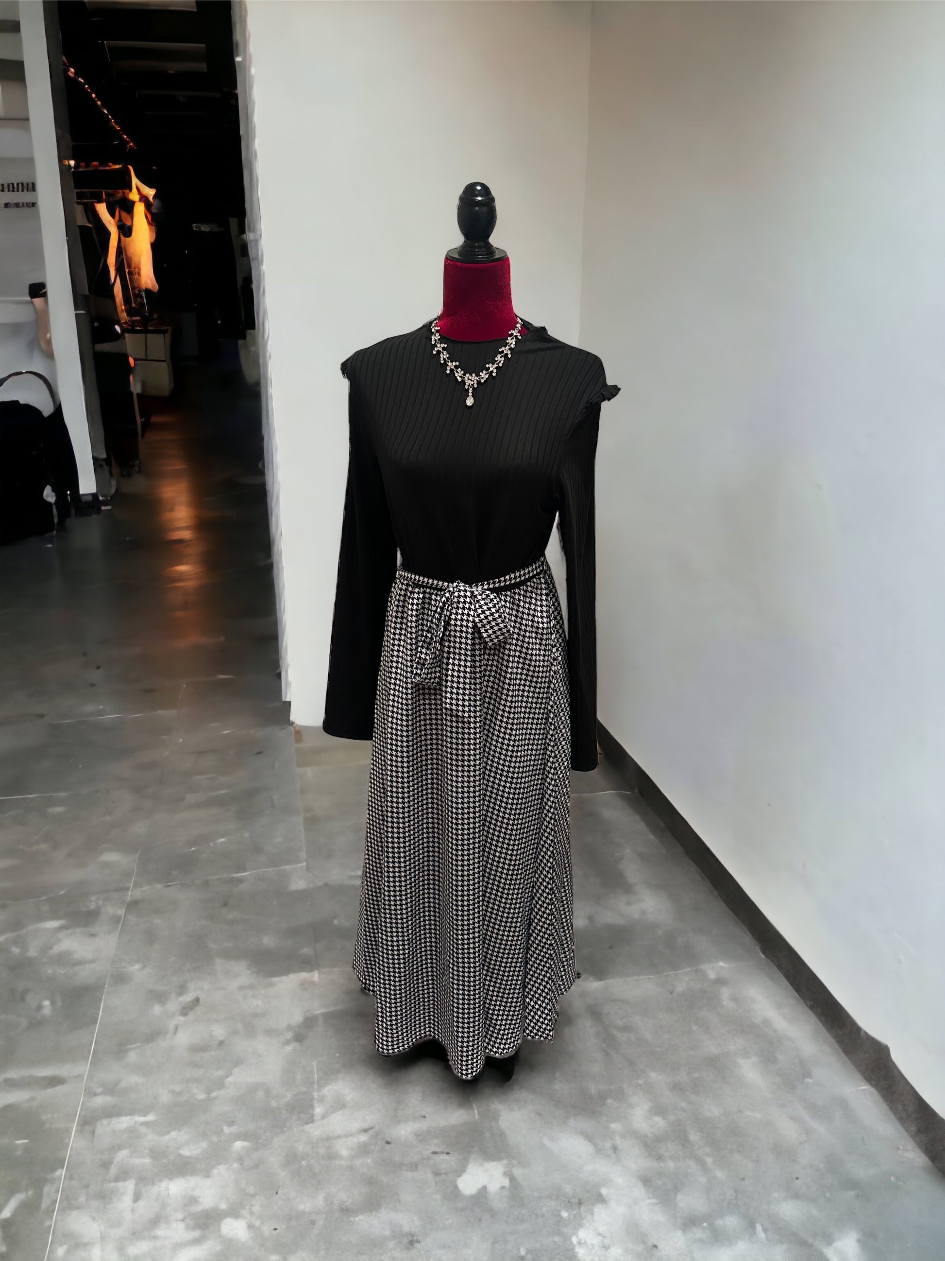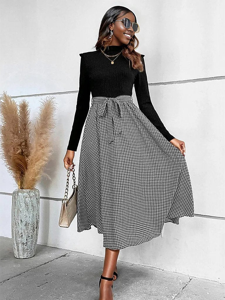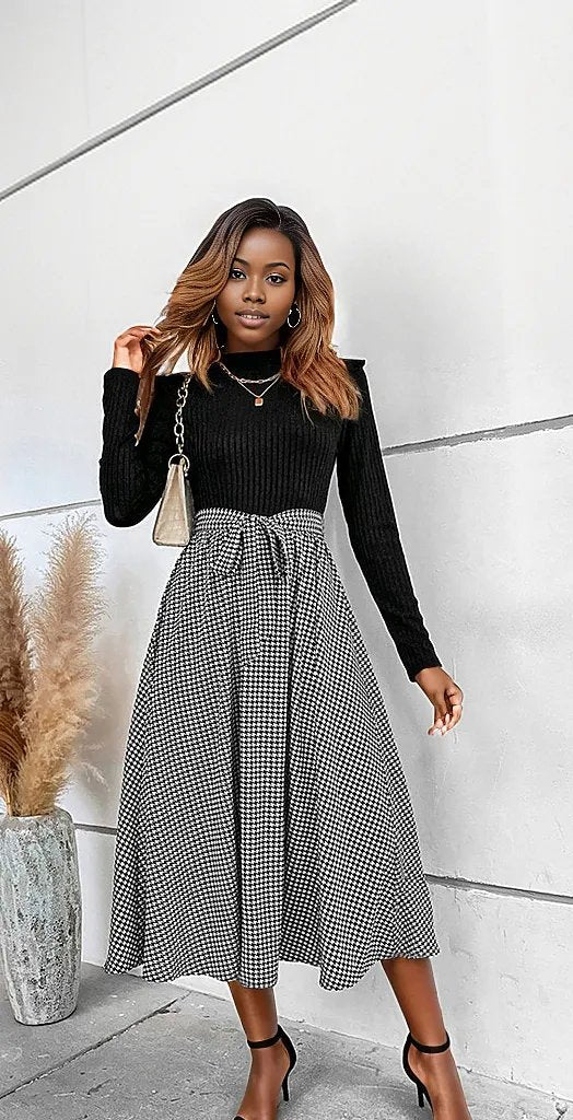 • This fibbed round neck long sleeve dress is a stylish fashion piece that is perfect for any occasion. The dress features a classic houndstooth pattern that is both timeless and trendy. The mock neck adds a touch of sophistication to the dress, while the tied feature adds a bit of playfulness.