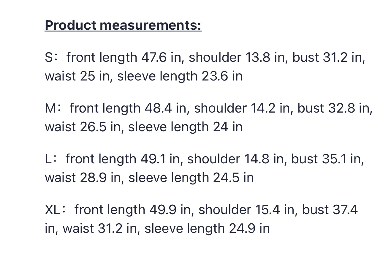 XL:front length 49.9 in, shoulder 15.4 in, bust 37.4 in, waist 31.2 in, sleeve length 24.9 in