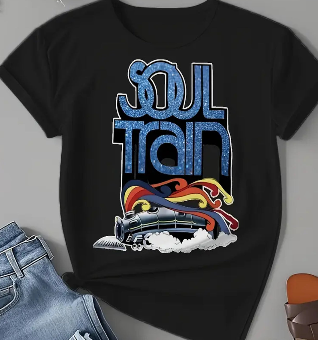 Women's Vintage Soul Train Graphic Tee - Black Retro 70s Disco Party Shirt with Blue & Red Accents - Soft Crew Neck Casual Everyday Top - Machine Washable Summer Blouse for Themed Events & Casual Attire, Classic Round Neckline, Comfortable Fit, Durable Print Design. Ships immediately from our California location!