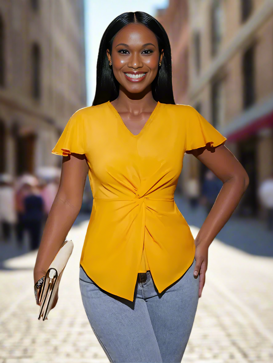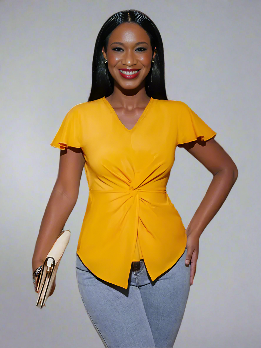 Twisted Solid V-Neck Cap Sleeve Blouse