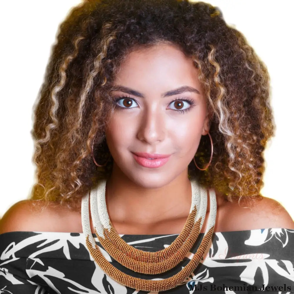 Meticulously handcrafted through time-honored methods, the White Zulu Maasai Triple Layered Necklace showcases exquisite white and gold beadwork. This distinguished fair trade adornment stands as a singular expression of the profound cultural legacy embodied by the Zulu and Maasai tribal artisans.